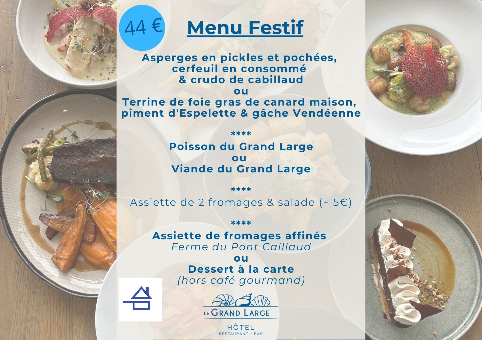 Terrine de foie gras de canard maison, piment d'Espelette & gâche Vendéenne 16,00 € 6 Huîtres de la Baie 11,00 € Asperges en pickles et pochées, cerfeuil en consomme & crudo de cabillaud 11,00 € Entrée du Grand Large - voir l'ardoise 0,00 € -