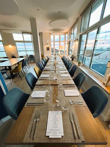 La salle de restaurant offre une vue imprenable sur l'océan.